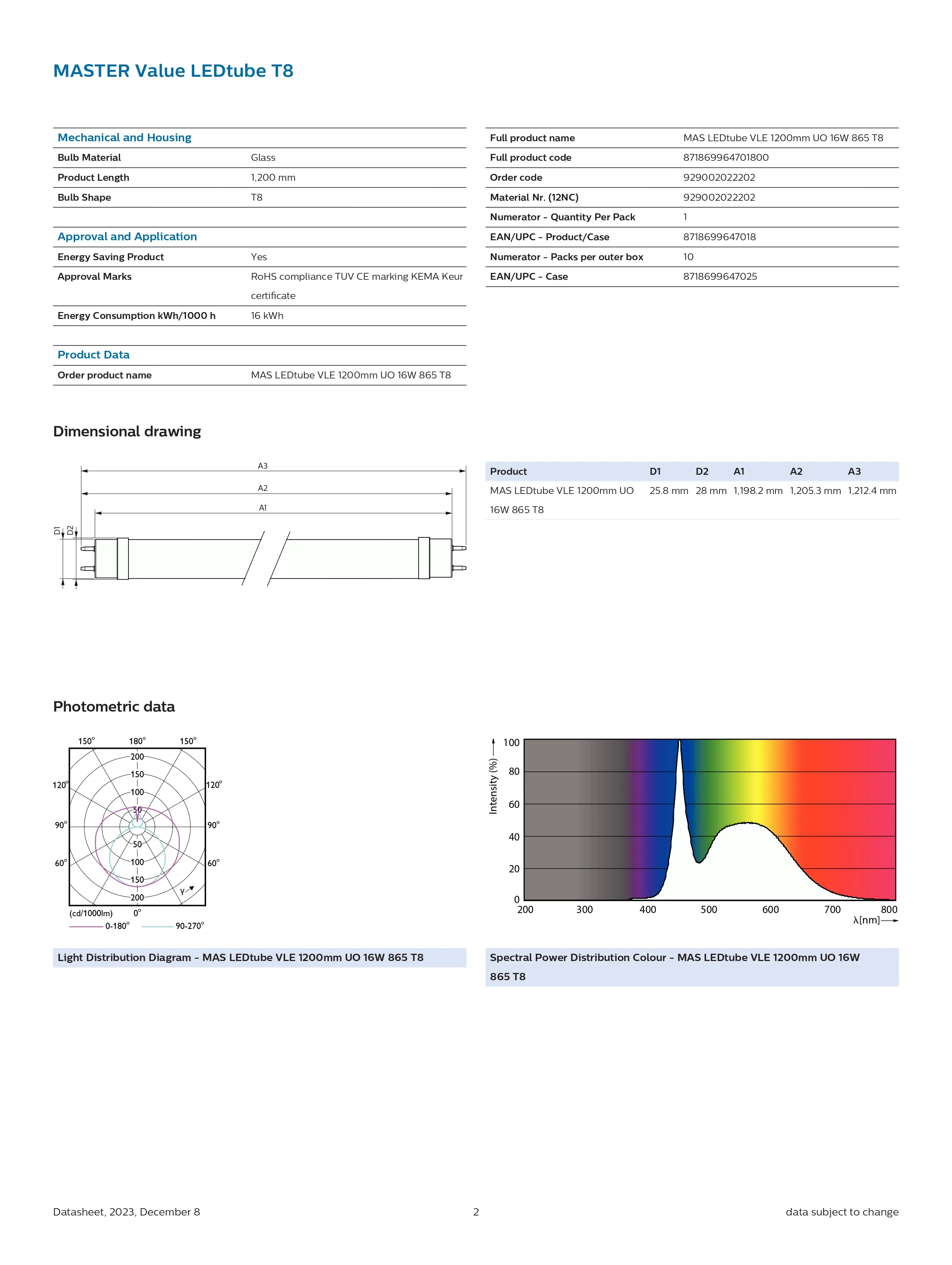 Bóng đèn Mas Ledtube VLE 1200mm UO 16w 865 T8