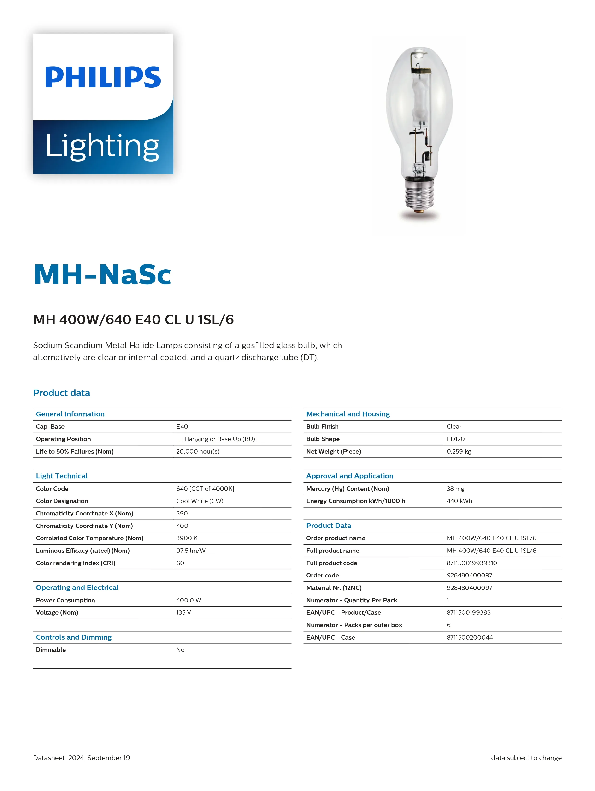Bóng đèn cao áp gián tiếp Philips Metal Halide MH 400W/640 E40
