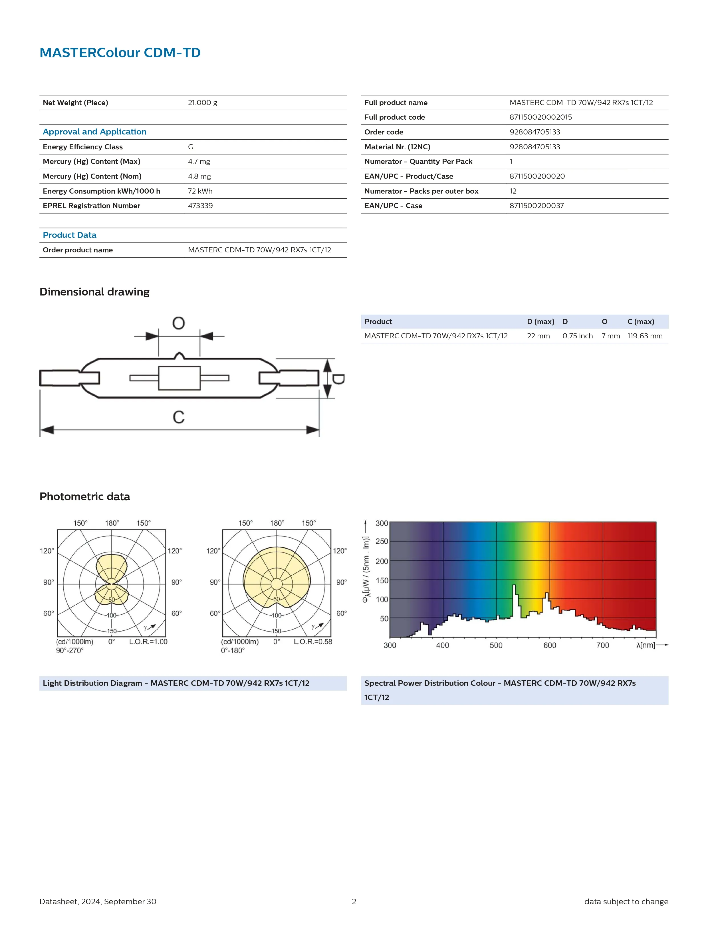 Bóng đèn cao áp Philips MASTERC CDM-TD 70W/942 RX7s 1CT/12